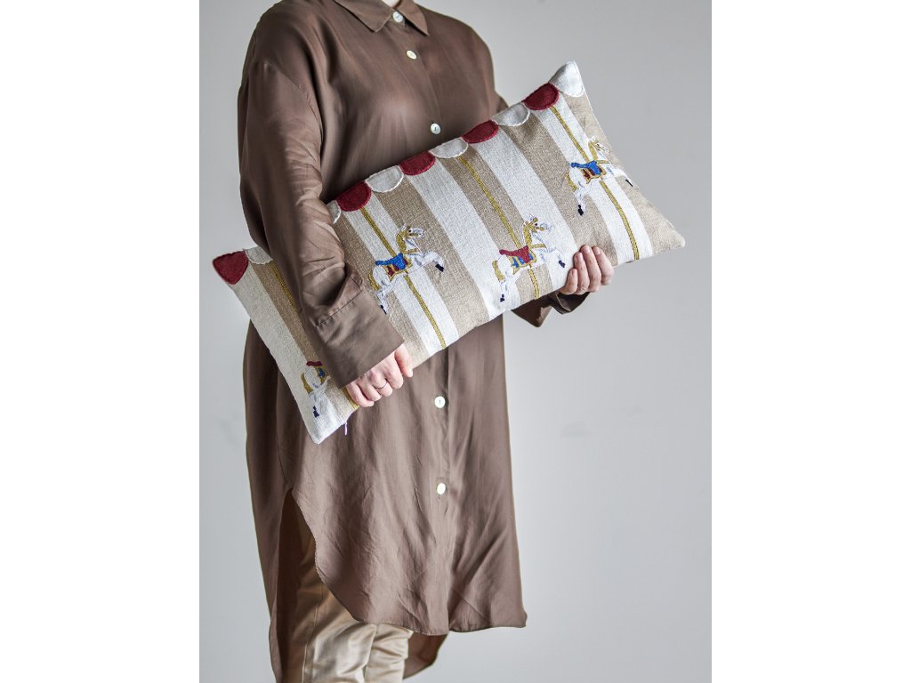 Obdélníkový polštářek s vánočním motivem vintage kolotoče. Polštářek můžete sladit s vyobrazenými ozdobami a dalšími produkty se stejnými motivy a navodit tak sváteční elegantní atmosféru.
