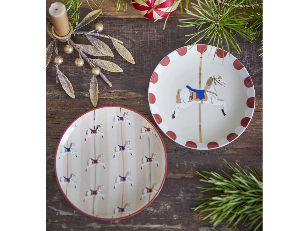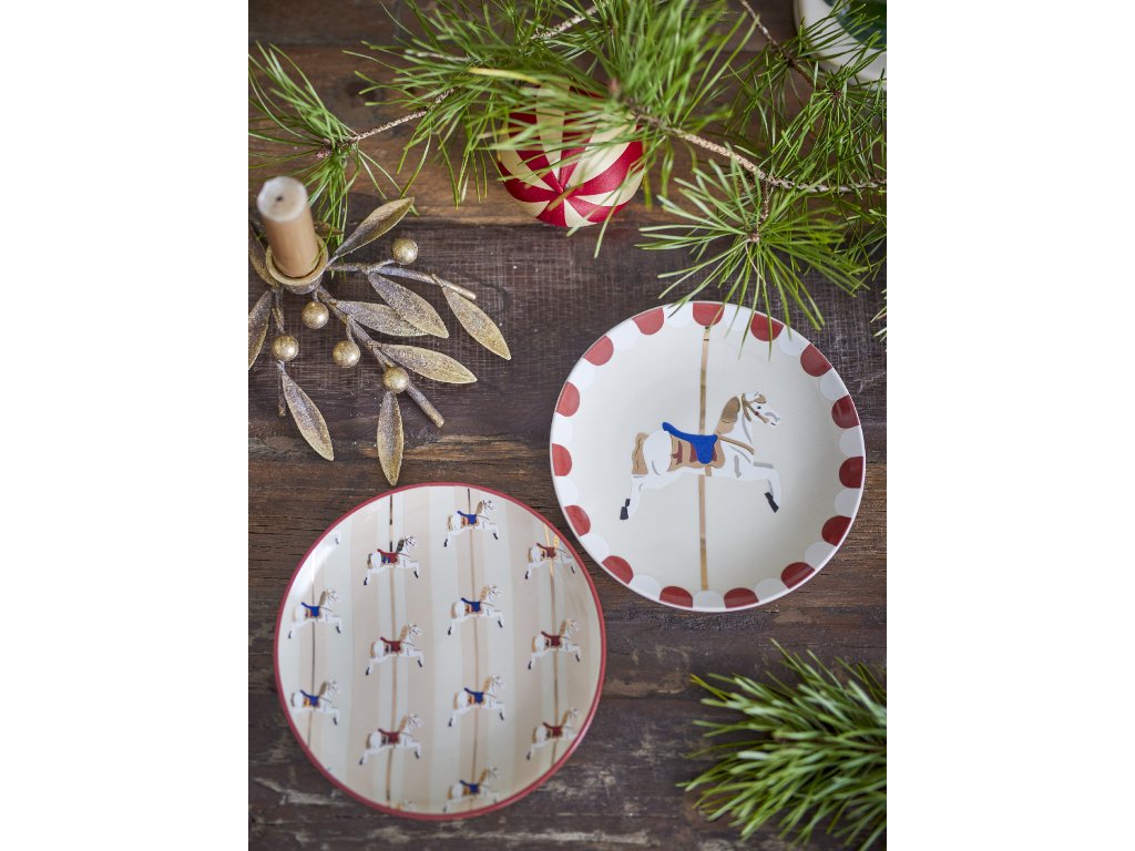 Sada dvou okouzlujících dezertních talířů Merry-go-round od Bloomingville je zdobena slavnostním vzorem kolotoče. Každý talíř je ozdoben ručně malovanými detaily, díky nimž je jedinečný a dodává mu nostalgické kouzlo. Ideální pro vytvoření útulné a hravé atmosféry u vánočního stolu nebo pro jiné zvláštní příležitosti. Talířek lze navíc doplnit i dalším nádobím se stejnými či ladícími motivy.