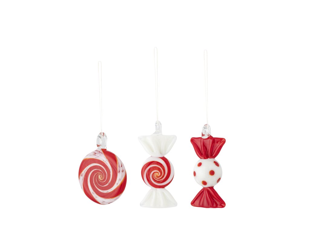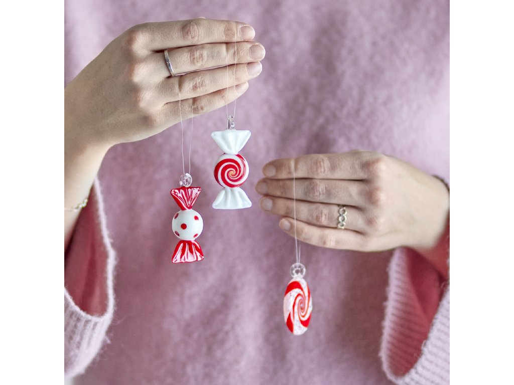 Skleněné ozdoby Festive ve vánočních barvách červené a bílé ale v hravém designu oblíbených bonbonků zaujmou dospělé i děti. Doplňte svůj Vánoční stromek o hravý prvek! V balení 3 ks.