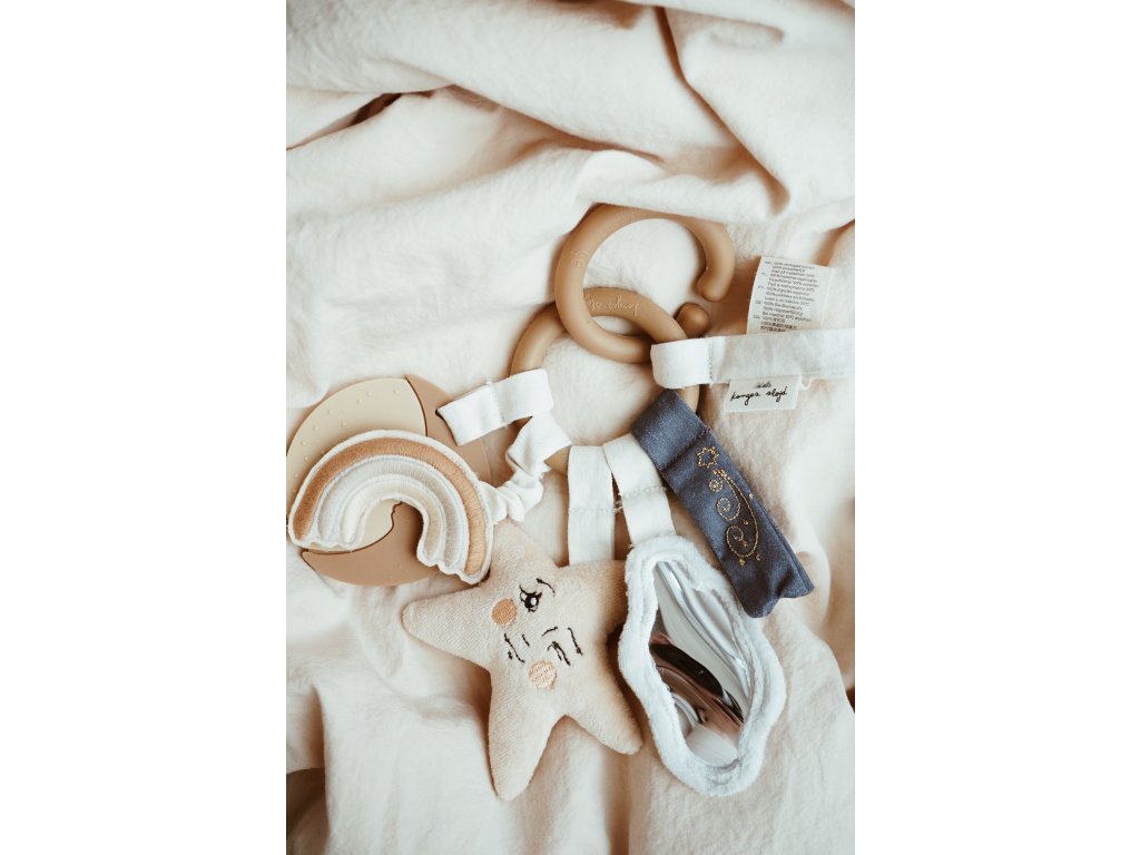 Měkký silikonový kroužek plný hraček pro nejmenší, které stimulují jejich smysly. Na kroužku najdete malý silikonový měsíc, cedulky ke zkoumání, měkké zrcátko s vyšívaným vzorem na zadní straně, plyšovou hvězdu s rolničkou a duhu, která šustí.