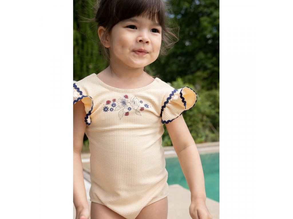 Nádherné dívčí plavky v retro designu s motýlkovými rukávy s kontrastním lemováním.