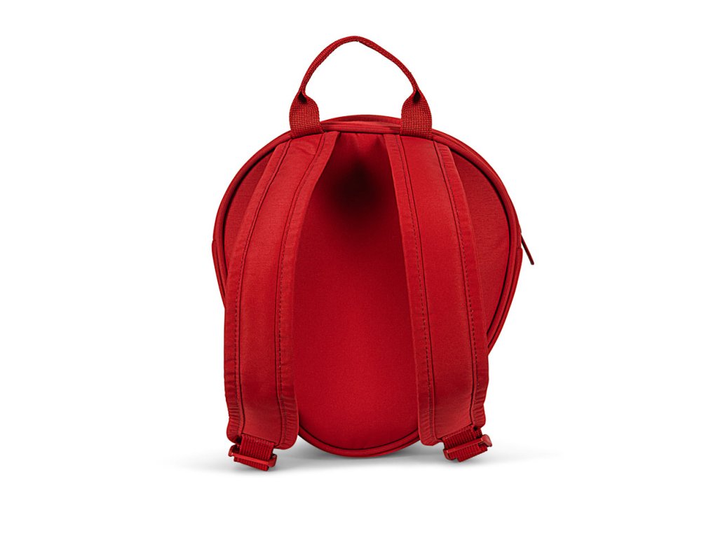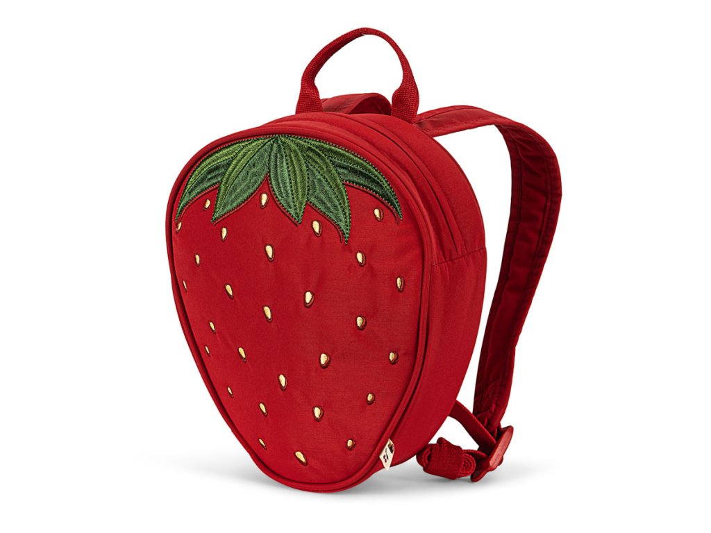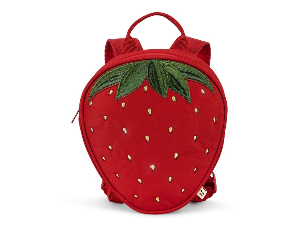 Rozkošný batůžek ve tvaru jahody má nastavitelné polstrované ramenní popruhy, praktické ouško, je extrémně lehký a měkký, s vyšívanými detaily.