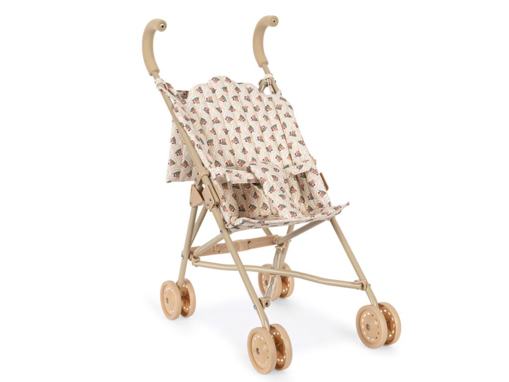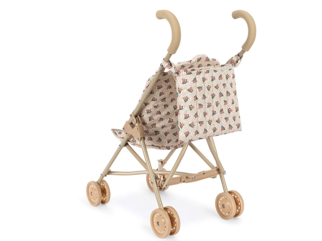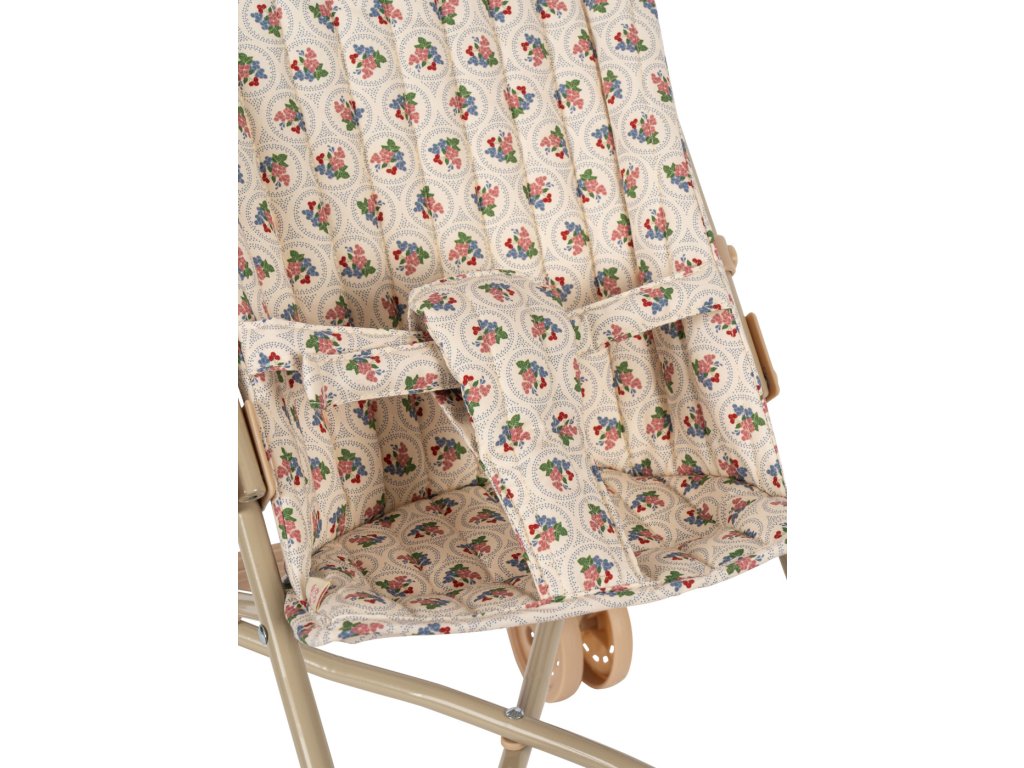 Sportovní kočárek pro panenku, takzvané "golfky", ve střídmém jemném designu. Retro laděný květinový podklad doplňuje béžová konstrukce a jemně růžové vyšívané květinky.
