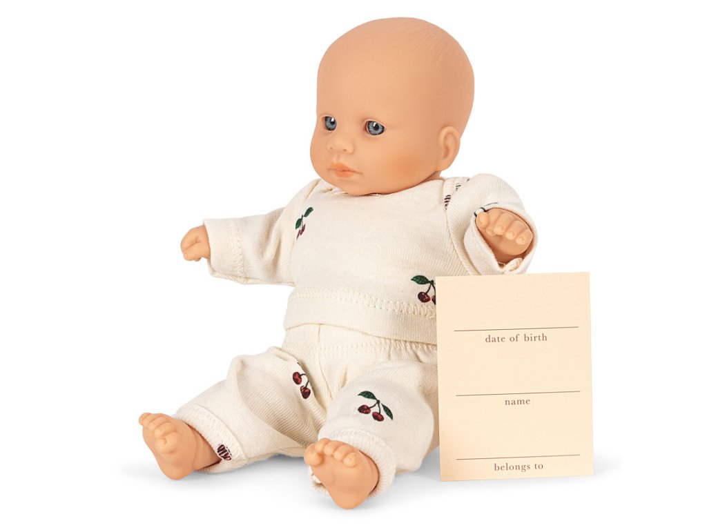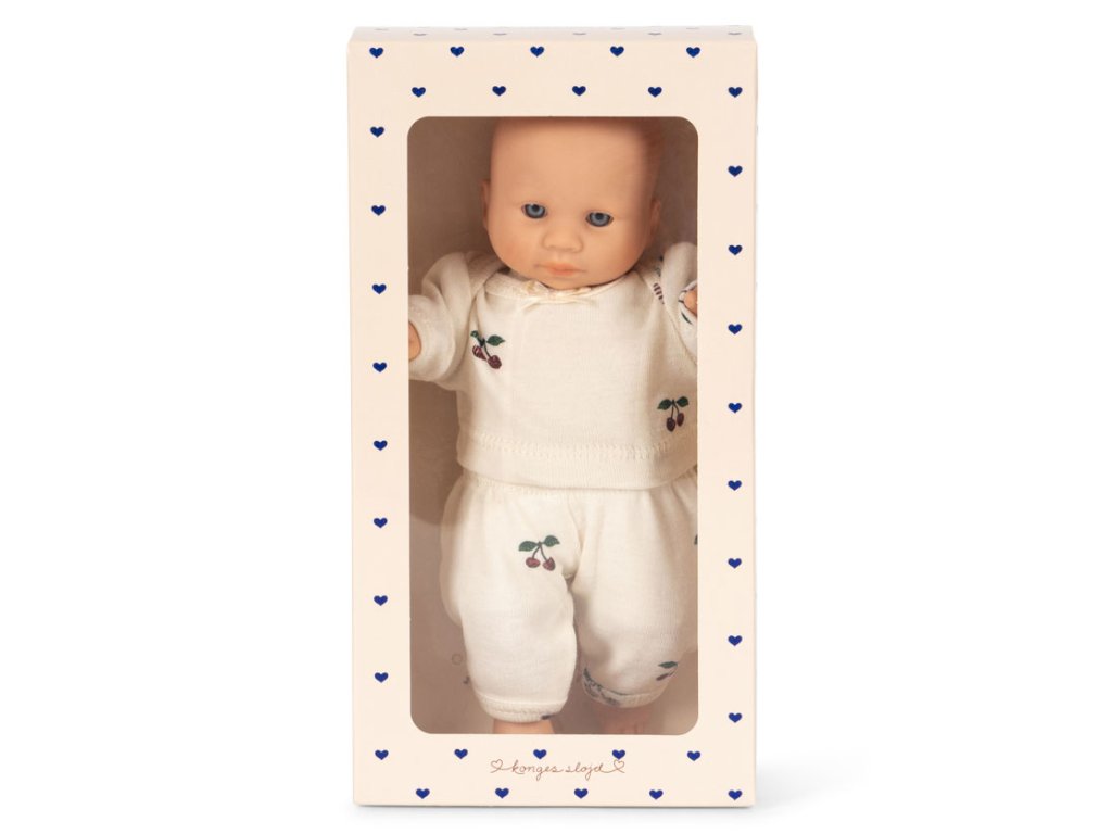 Panenka s měkkým tělíčkem dánské značky Konges Slojd oblečená v kompletu s třešinkovým signature vzorem. Malá jen něco okolo 20 cm je ideální už pro nejmenší děti nebo třeba jako cestovní panenka, která se schová i do menšího batůžku. V dárkové krabičce.