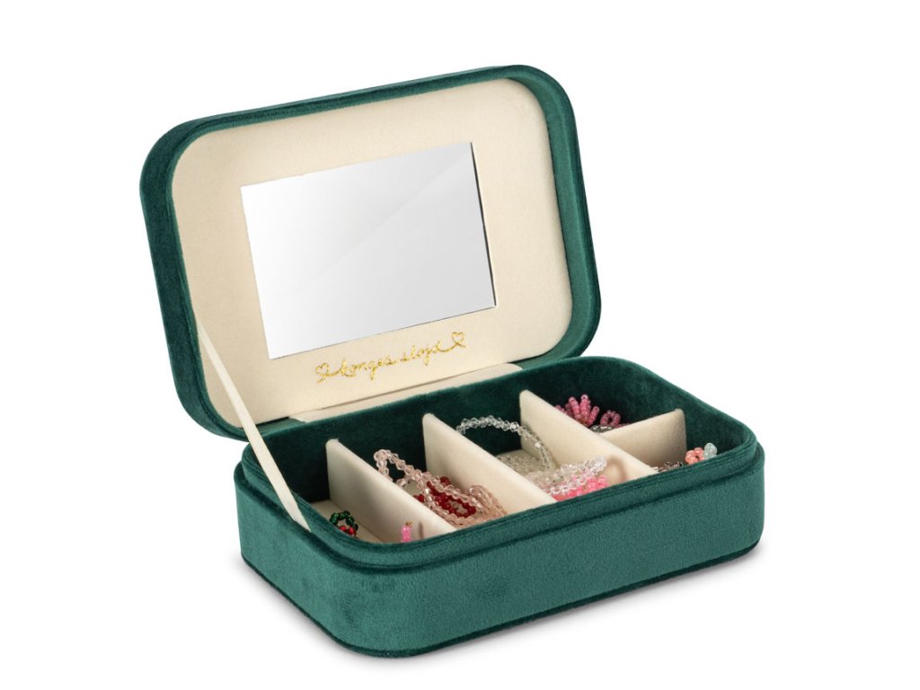 Překrásná dětská sametová šperkovnice v sytě růžovém odstínu. Na spodní straně víka má praktické zrcátko a jednotlivé oddíly jsou již plné dokonalých pokladů pro malé slečny.