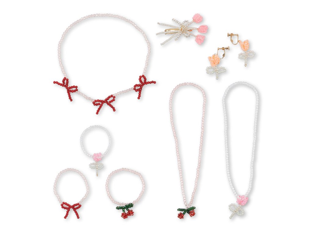 V krabičce najde: 2 náhrdelníky, 1 náramek, 3 prstýnky, 1 sponka a překrásné náušnice