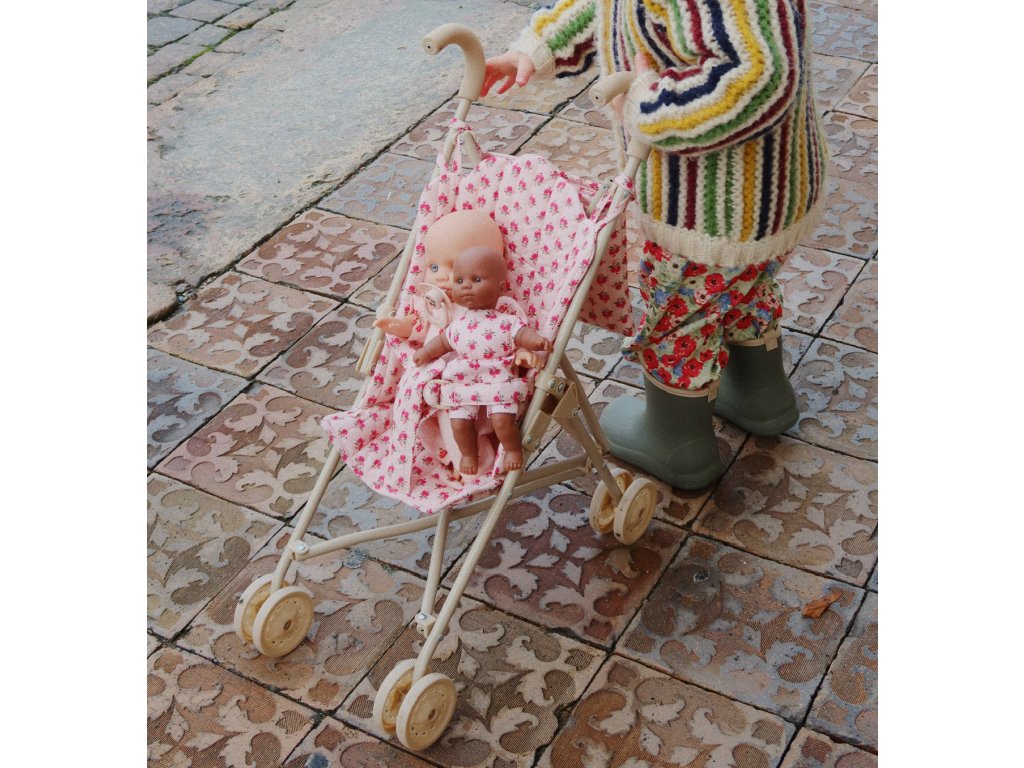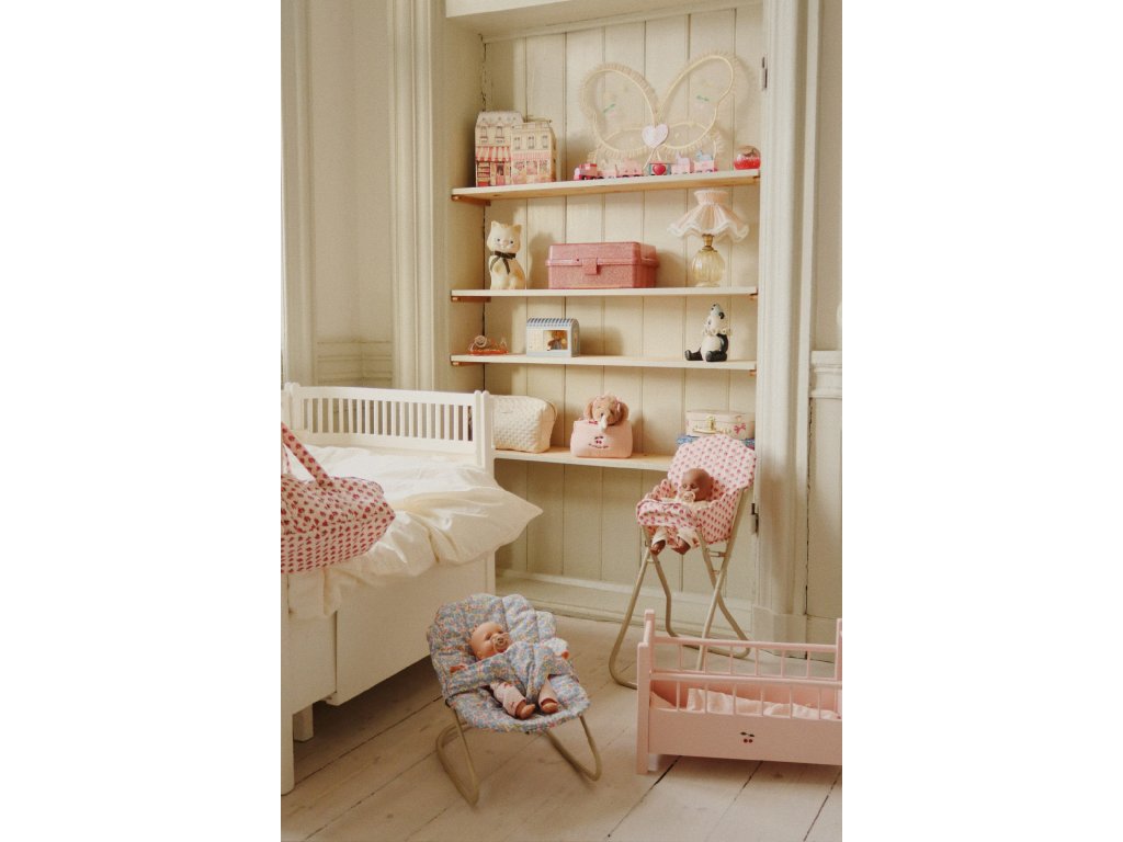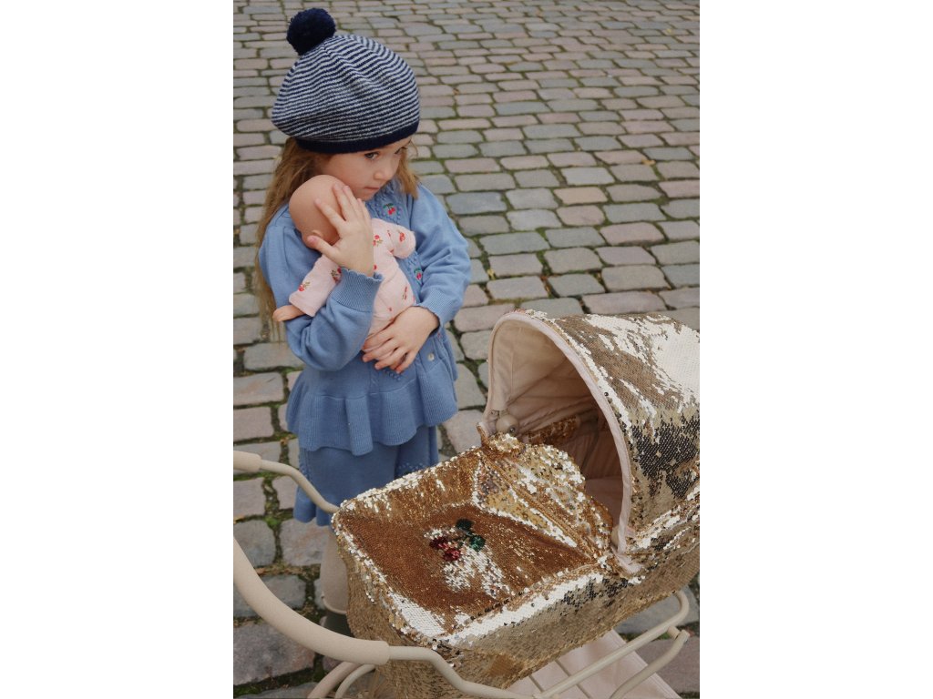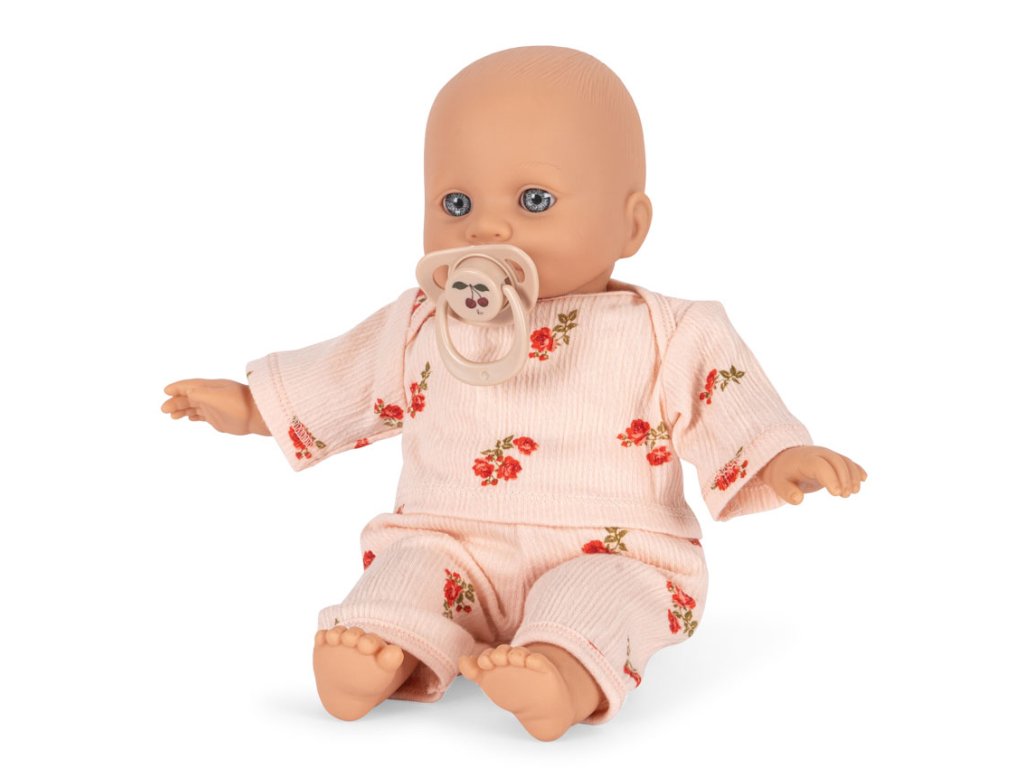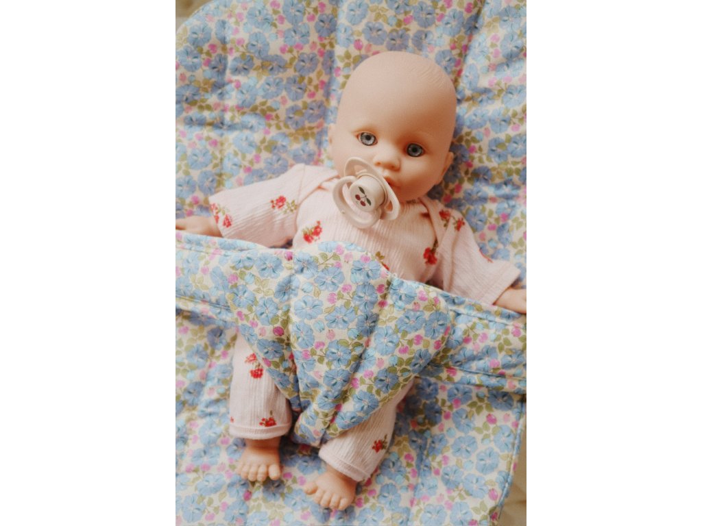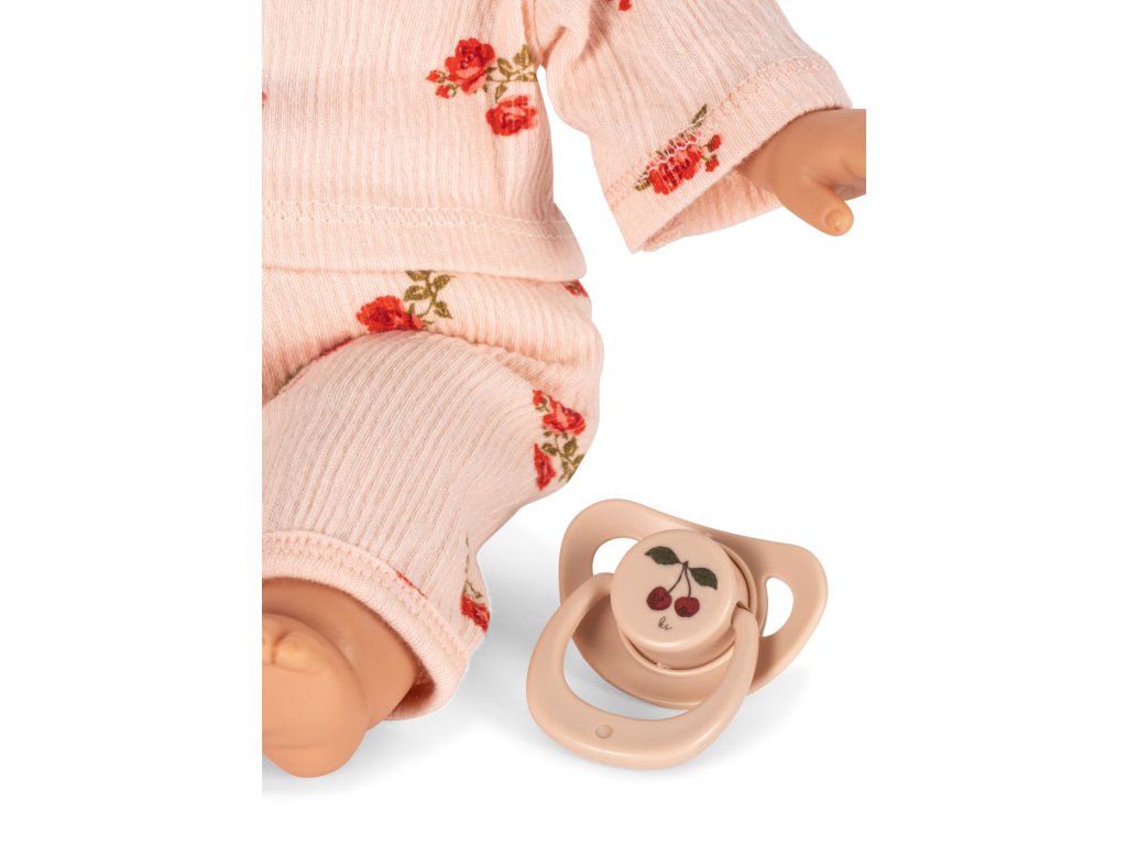 Panenka s měkkým tělíčkem dánské značky Konges Slojd oblečená v kompletu s třešinkovým signature vzorem a s dudlíkem, který panence drží v pusince. Elisa je o něco menší než její příbuzné panenky Alfie a Gerd.