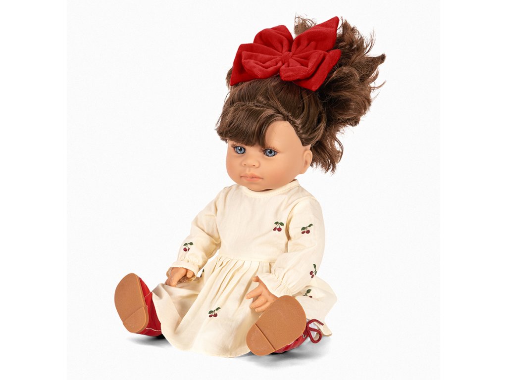 Panenka s pevným vinylovým tělíčkem dánské značky Konges Sloejd oblečená do šatiček ss třešinkami, s velkou sametovou mašlí do vlásků a dokonalými retro botičkami. Odette je oblečená tak, aby zaujala svými šaty a dlouhými vlasy, které jsou ideální pro vyzkoušení různých účesů. Odette bude perfektním dárkem a je dodávána v roztomilém a dekorativním balení.