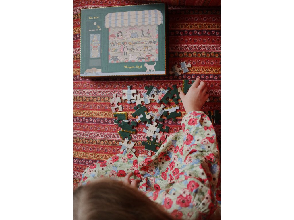 Roztomilé puzzle se 100 dílky zobrazující krásnou výlohu butiku Konges Sløjd v Gothersgade v Kodani.