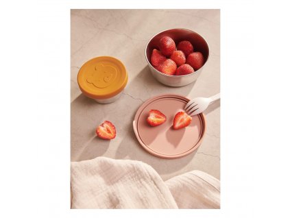 Lehký svačinový box z nerezové oceli se silikonovým víčkem. Nerezová ocel je ideální pro uchování potravin, protože neabsorbuje barvy ani vůni uloženého jídla. Svačinový box je rozdělen do tří částí pro uložení rozdílných potravin. Krytý je silikonovým víčkem s vyraženým obrázkem zvířátka Liewood. Svačinový box je vhodný do myčky.