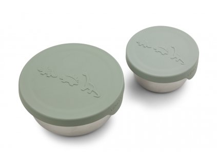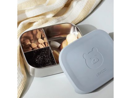 Lehký svačinový box z nerezové oceli se silikonovým víčkem. Nerezová ocel je ideální pro uchování potravin, protože neabsorbuje barvy ani vůni uloženého jídla. Svačinový box je rozdělen do tří částí pro uložení rozdílných potravin. Krytý je silikonovým víčkem s vyraženým obrázkem zvířátka Liewood. Svačinový box je vhodný do myčky.