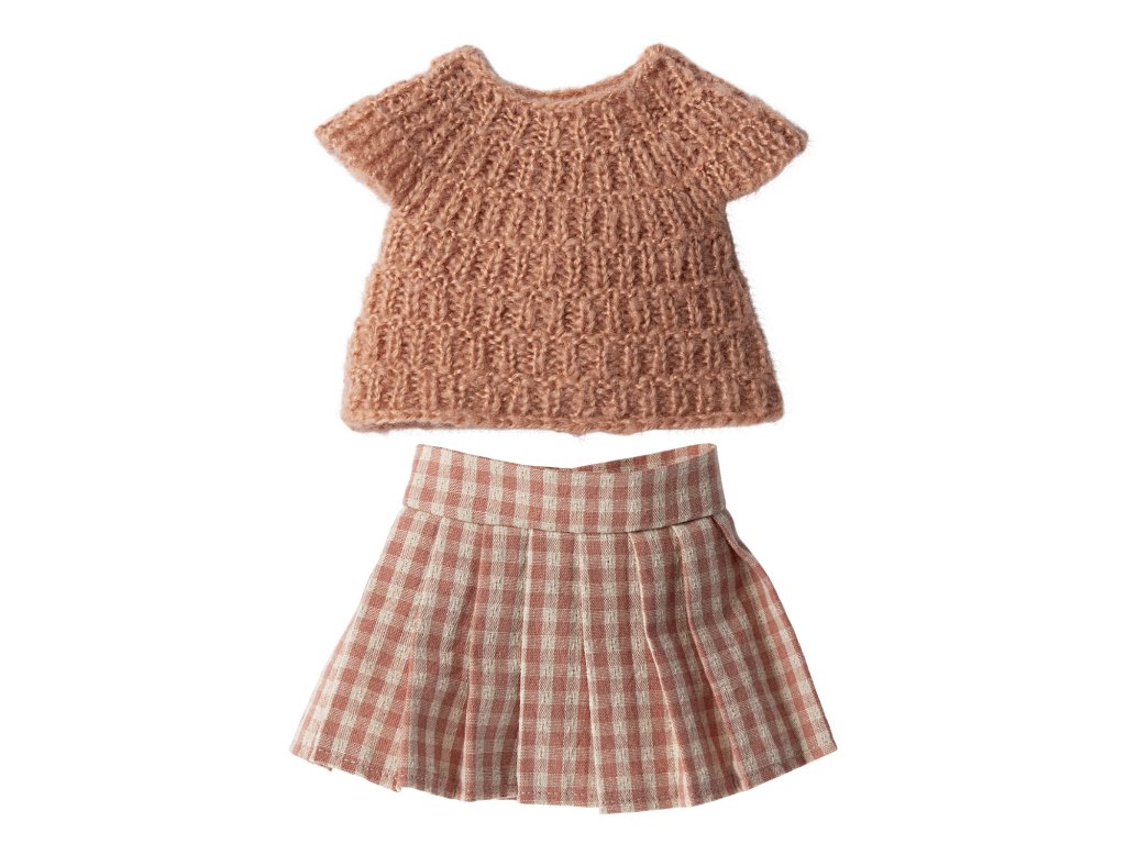 Háčkovaná blůzička s kostkovanou sukničkou pro zajíčka velikosti 3. Dánská značka Maileg dbá na kvalitu zpracování a její ručně šité hračky jsou zosobněním kouzelného dětství. Myšky, králíčci i ostatní zvířátka Maileg jsou právě ty hračky, které se dědí po generace.