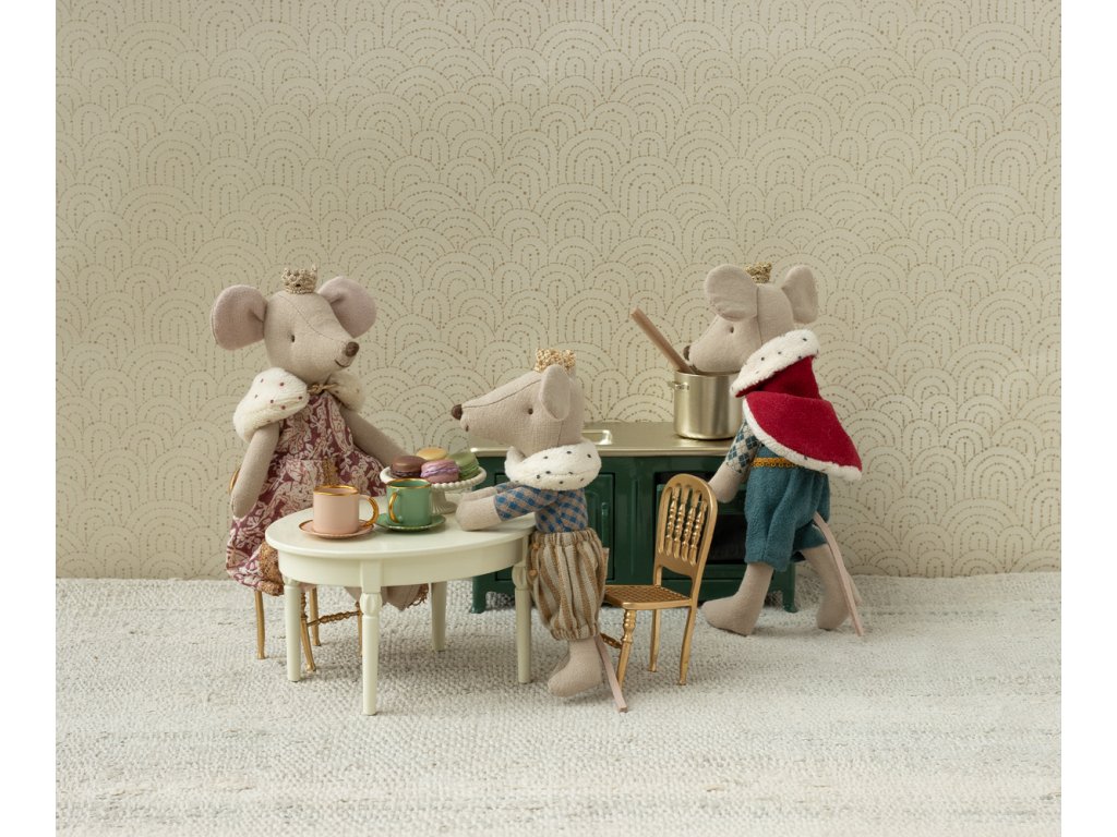Prostorný a stylový jídelní stůl pro myšky a jejich rušné snídaně i sváteční obědy. I když klame tělem a vypadá jako dřevěný, ve skutečnosti je kovový a ustojí tak daleko více dětského bláznění.