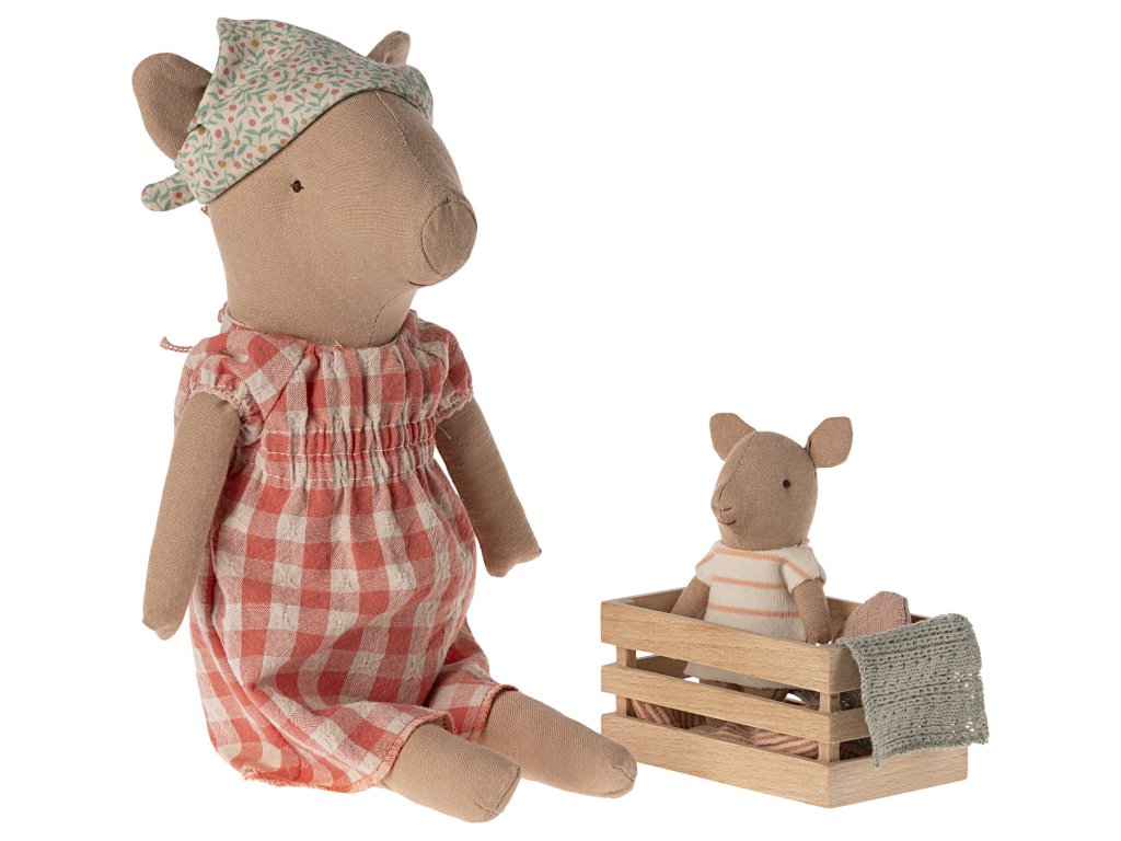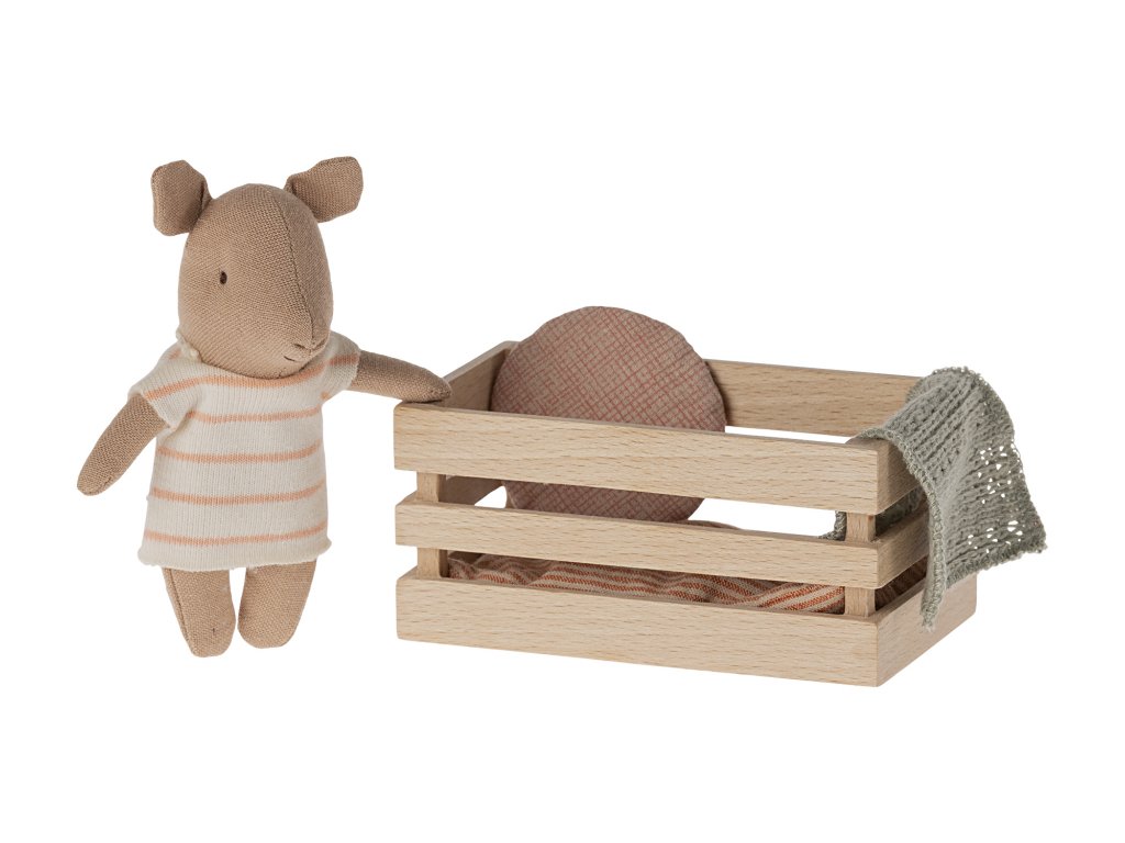 Malé lněné prasátko s postýlkou v dřevěné krabičce. Neodolatelný kamarád z rodiny Maileg.