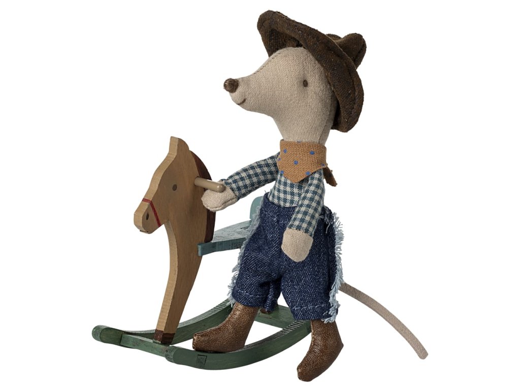 Maileg Myšák kovboj s dřevěným houpacím koníkem Maileg Cowboy Mouse on Rocking Horse, Little Brother