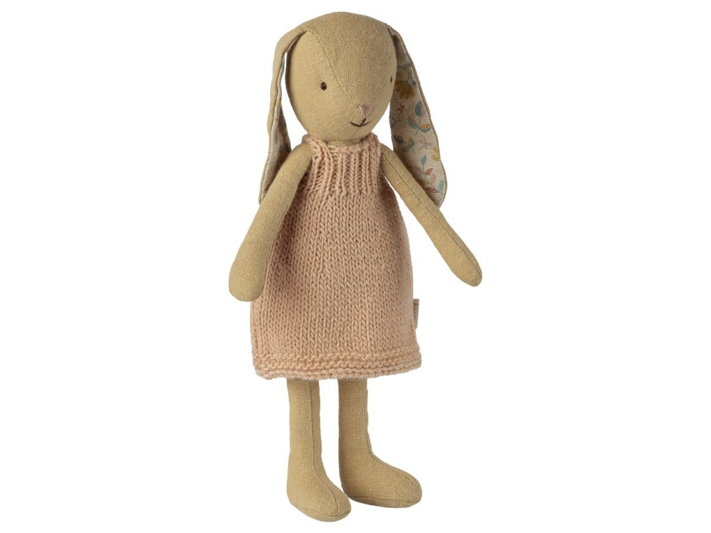 Lněný králíček ve světlých pletených šatičkách bude určitě skvělou kamarádkou nejen do postýlky. Dánská značka Maileg dbá na kvalitu zpracování a její ručně šité hračky jsou zosobněním kouzelného dětství. Myšky, králíčci i ostatní zvířátka Maileg jsou právě ty hračky, které se dědí po generace.