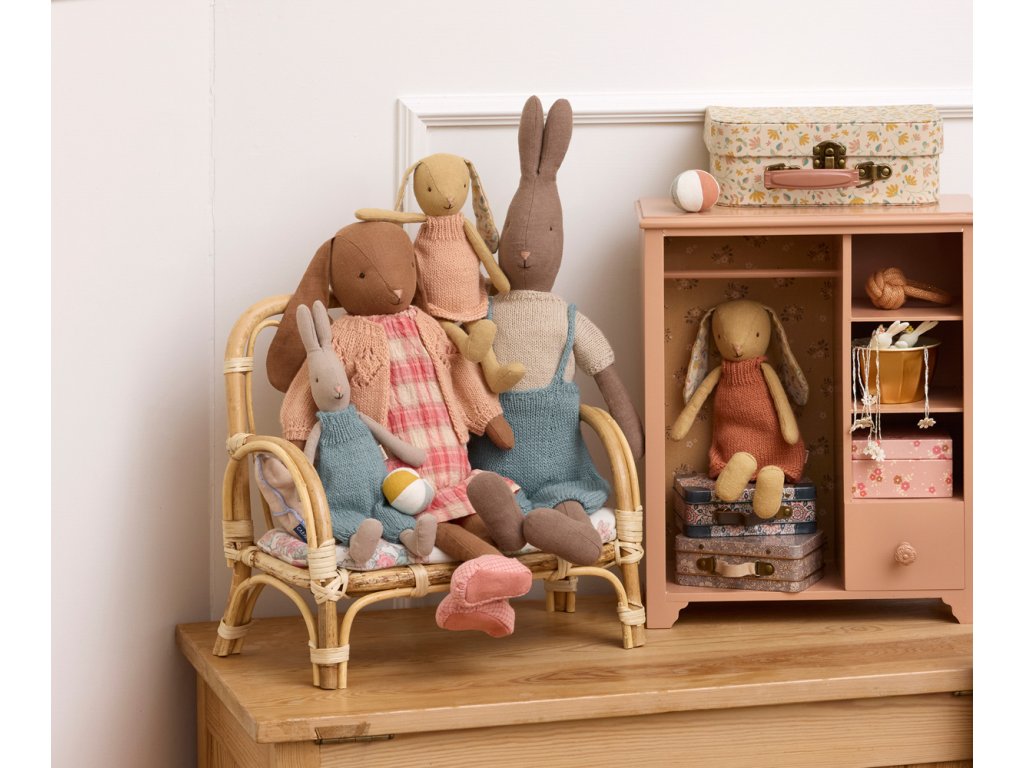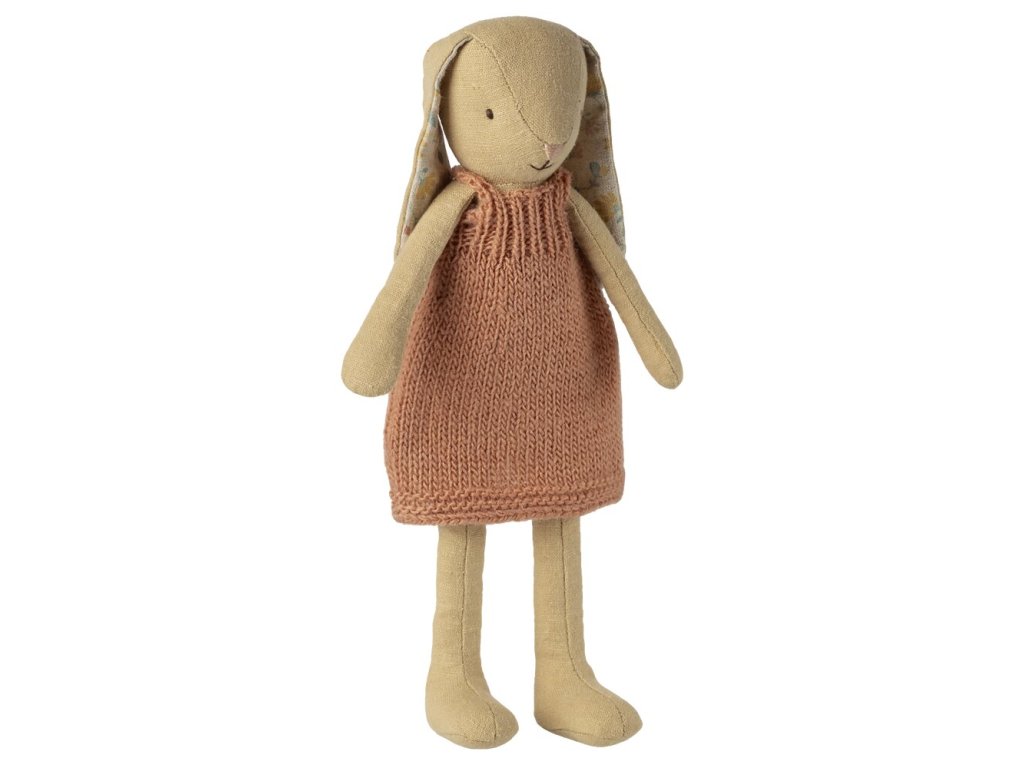 Lněný králíček v neodolatelných pletených šatech je připravený se stát nejlepším kamarádem Vašich dětí nejen do postýlky. Dánská značka Maileg dbá na kvalitu zpracování a její ručně šité hračky jsou zosobněním kouzelného dětství. Myšky, králíčci i ostatní zvířátka Maileg jsou právě ty hračky, které se dědí po generace.