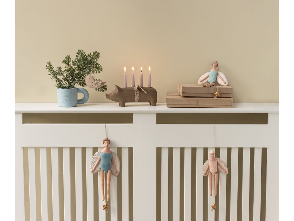 Do vánočního světa Maileg byli přidáni ti nejkrásnější andělé. Je ručně vyrobený s láskou ke všem detailům a po zatáhnutí provázku skáče. Ručně malované detaily a jemné barevné tóny z této závěsné dekorace dělají unikát, který budete každoročně s láskou vybalovat a zdobit si jím svůj domov.