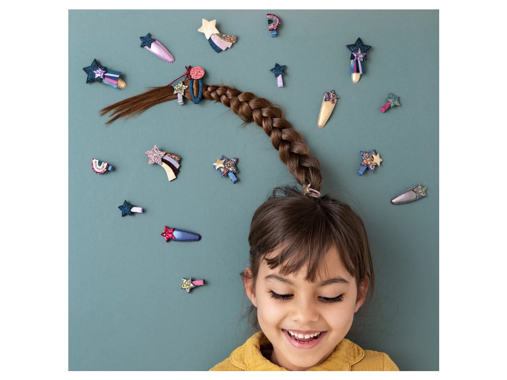 Sponečky do vlásků s třpytivými hvězdičkami. Díky zoubkům na krokodýlků dobře drží na místě a vydrží tak i divoké dětské dovádění. 6 ks v balení.